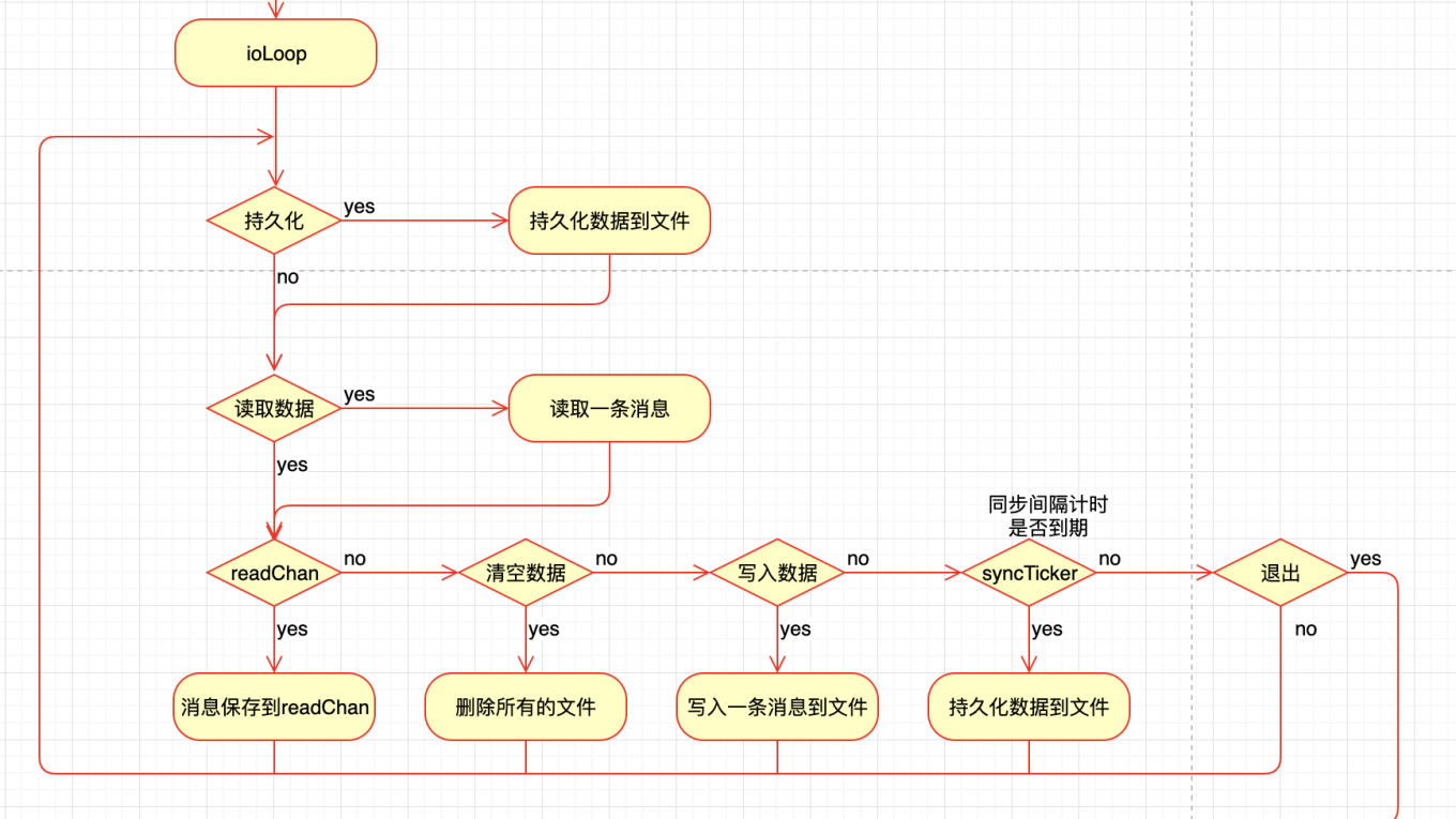 go-diskqueue 會啟動一個gorouting進行讀寫數據也就是方法ioLoop