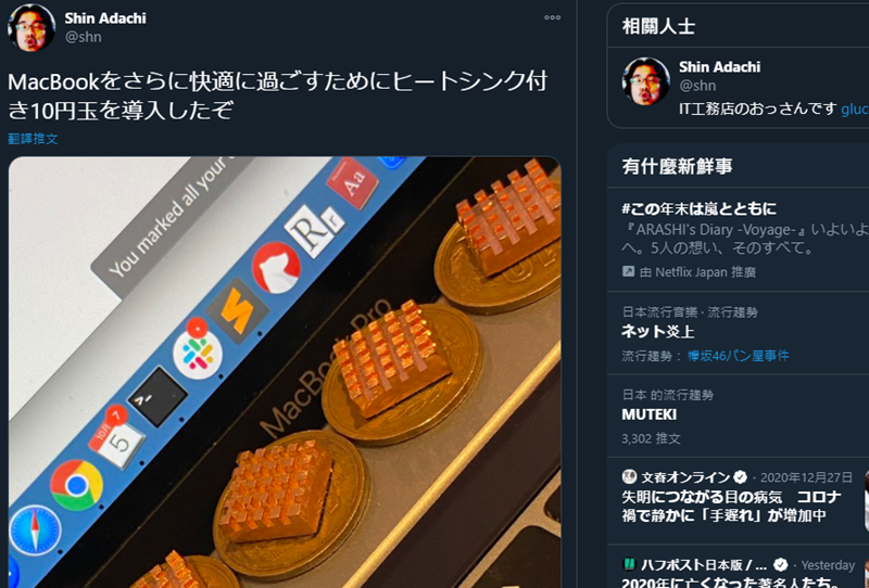 當然,這民間散熱法確實有效,不過這位日本網友不知是嫌散熱不夠還是怎樣,竟然再加上散熱片,推文還寫著:這可以讓 MacBook 更加舒適快活。至於有沒有效,他就沒有特別說明,當時(10/5)也沒有引起太多討論: