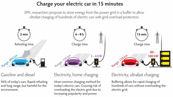 EFPL的科學家表示,他們已經找到解決這一問題的方法,不必從電網中獲得全部電能。這種方法就是利用緩衝存放區系統,在釋放4.5MW電功率前斷開與電網的連接。EPFL工業電子實驗室研究員Alfred Rufer 說:「我們發明了一種中間存儲系統,利用緩衝記憶體,充電站可以不用連接電網,給汽車充電。」該技術可以利用民用低壓電網或地區性中壓電網完成,這樣可以顯著減少投資。