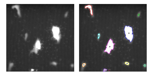 斑點分析的算法非常簡單:在圖像中,相關對象的像素(也稱為前景)通過其灰度值來識別。例如,圖中示例显示了液體中的組織顆粒。這些粒子是明亮的,液體(背景)是暗的。通過選擇明亮的像素(閾值),可以很容易檢測到顆粒。在許多應用中,暗像素和亮像素的簡單條件不再成立,但結果相同可以通過額外的預處理或像素選擇/分組的替代方法來實現。