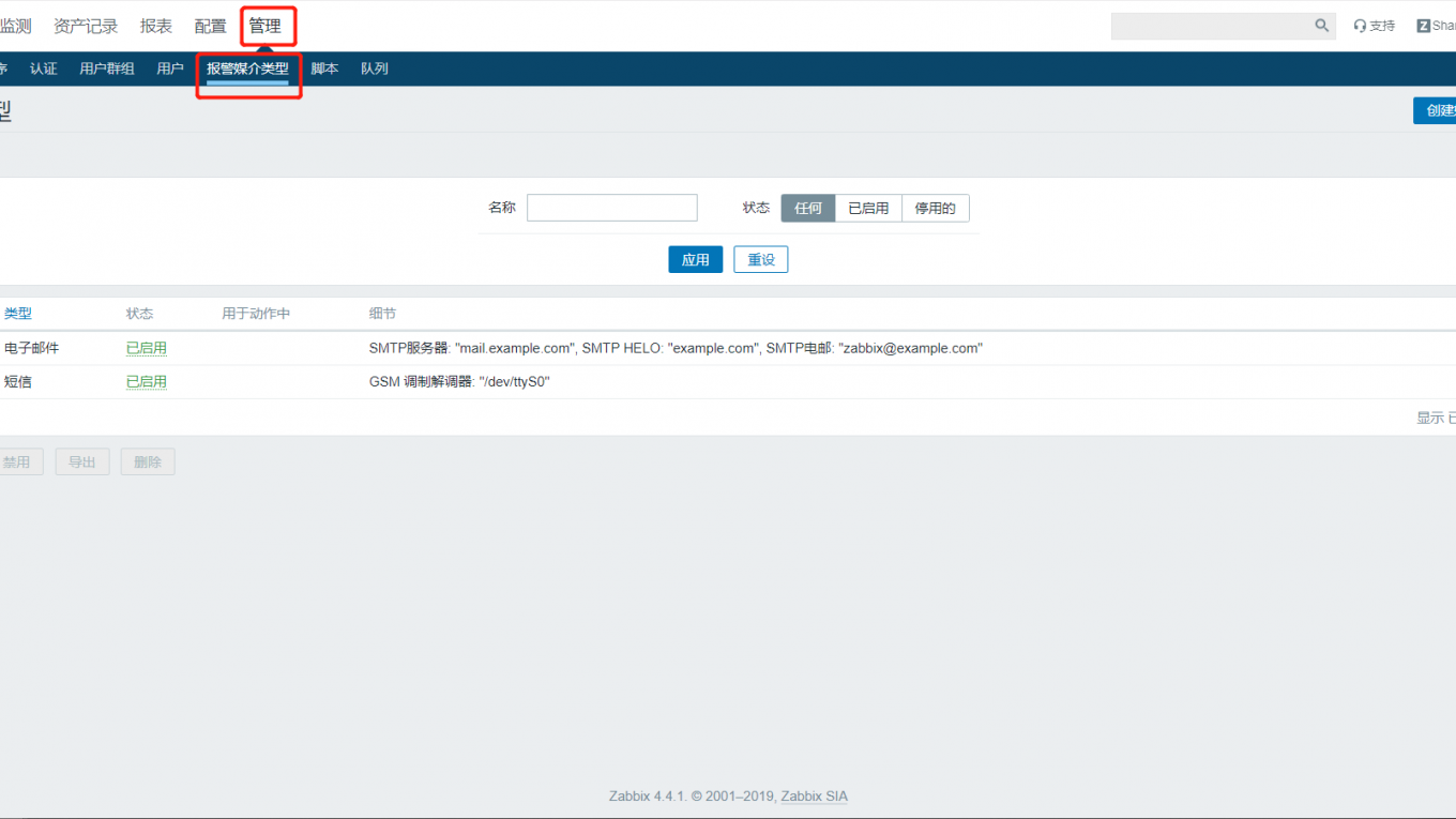 Zabbix默認自帶了2種報警媒介類型(Media Type),电子郵件以及短信,我們將修改电子郵件類型配置,並新建腳本類型和Webhook類型。希望通過腳本、Webhook告警媒介發送釘釘消息。